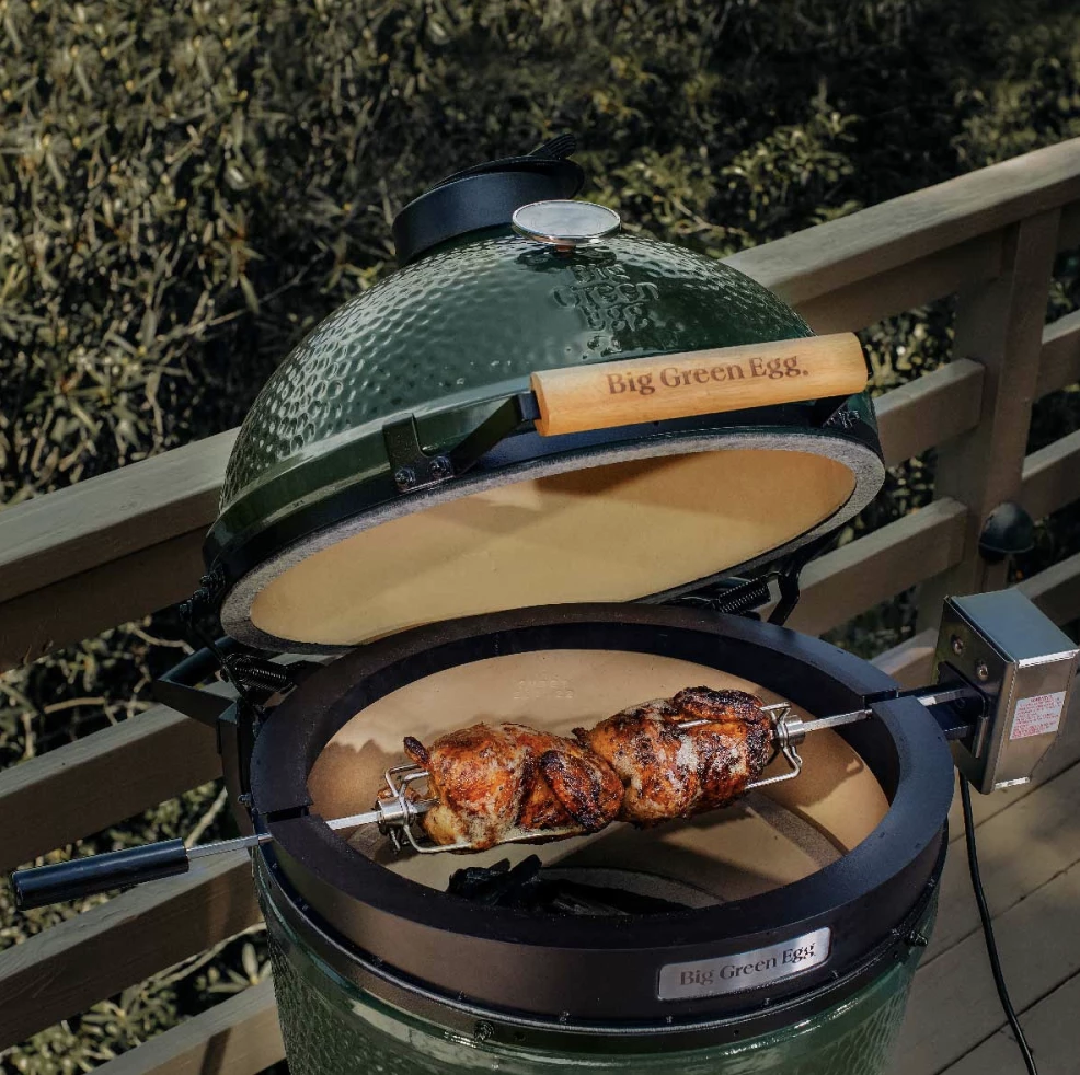 Verander je Big Green Egg in een houtgestookte rotisserie! Deze complete rotisserie set heeft een krachtige maar stille 220V-motor die het eten consistent en gelijkmatig direct of indirect boven het hete houtskool laat draaien.
