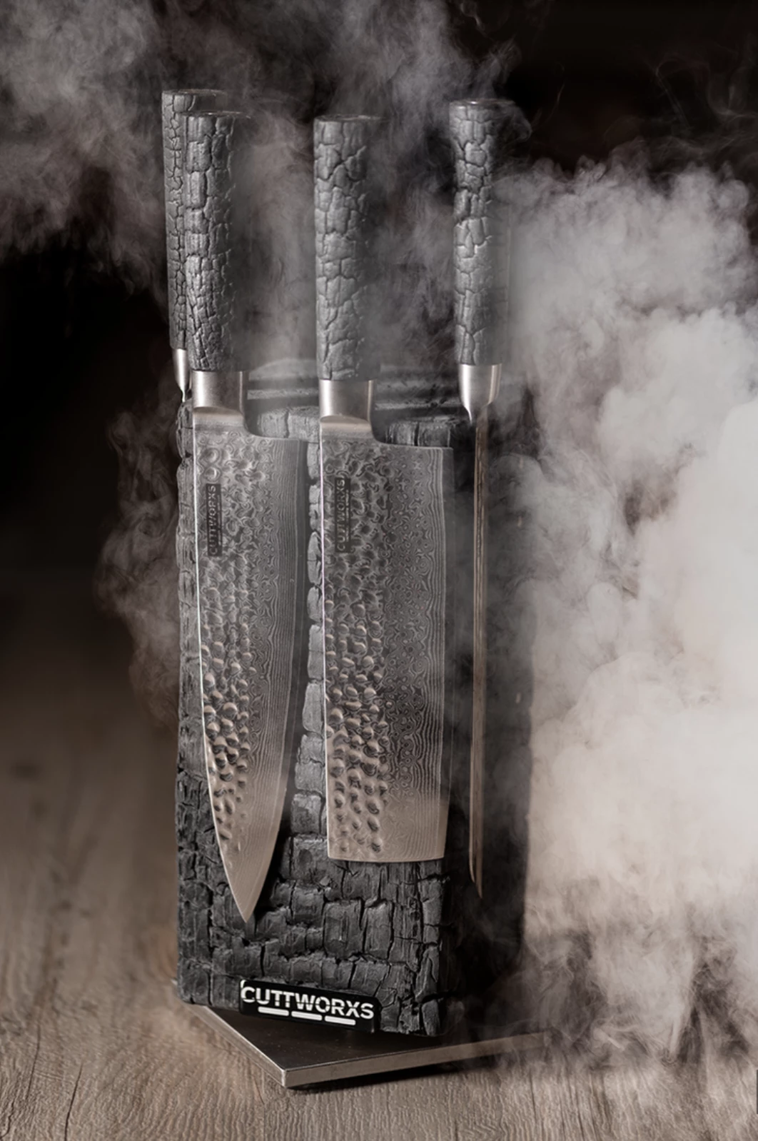 Uniek in de wereld zijn de mesheften en blokken gemaakt van gebrand hout. In een gepatenteerd proces wordt de gebrande laag geïmpregneerd met een kunststof om hem zijn sterkte te geven.