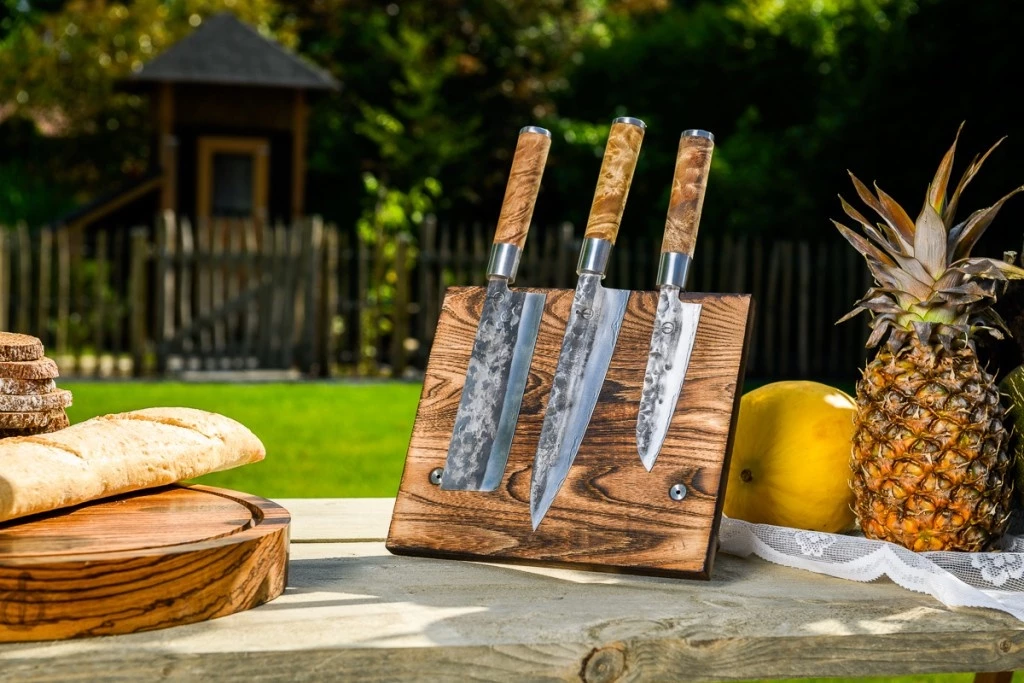 De wortelhouten handgreep oogt zeer luxe en is mooi afgewerkt. Het mes wordt geleverd in een luxe houten tray, inclusief een lederen messchede, om het mes veilig in op te bergen.